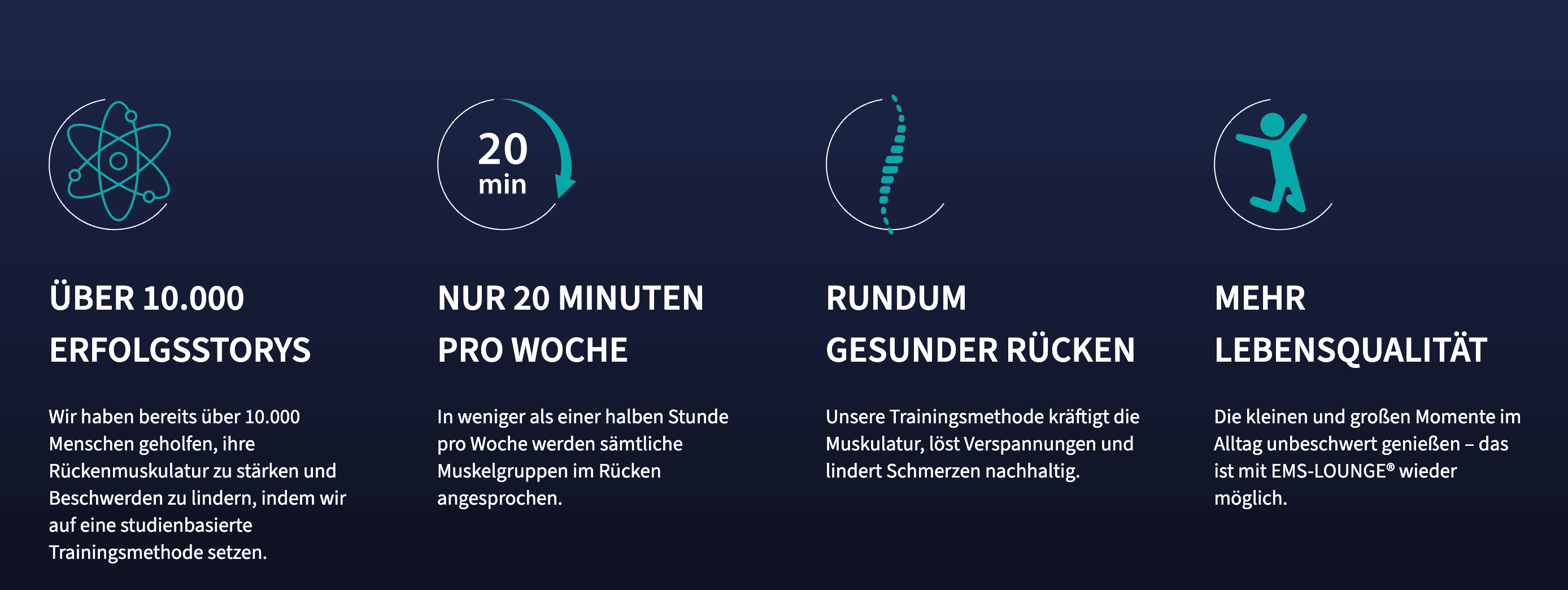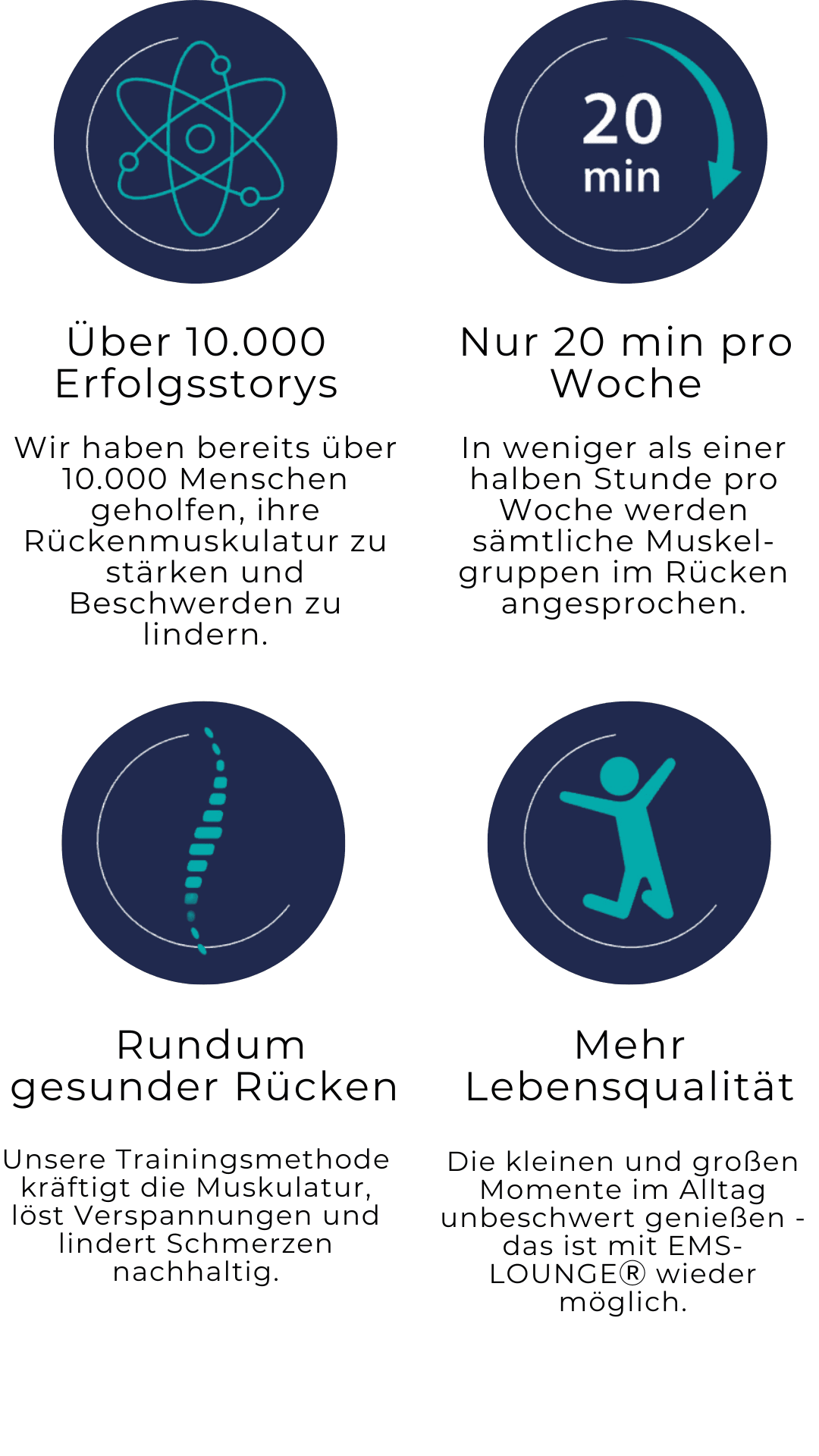 EMS (kurz für Elektro-Muskel-Stimulation) ist eine innovative Methode, die auf einem körpereigenen Prinzip basiert: Jede Bewegung, die wir ausführen, wird durch einen bioelektrischen Impuls vom Gehirn ausgelöst. Bei der EMS-LOUNGE® Methode trägst Du eine Funktionsweste mit Elektroden, die diesen Impuls direkt an die Hauptmuskelgruppen weitergeben. Dadurch wird das körpereigene Prinzip um ein Vielfaches verstärkt. So ist es möglich, mit minimalem Aufwand muskuläre Dysbalancen effektiv und nachhaltig zu beheben.